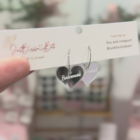 Bridesmaid earrings made with acrylic. Custom options for text and colour available