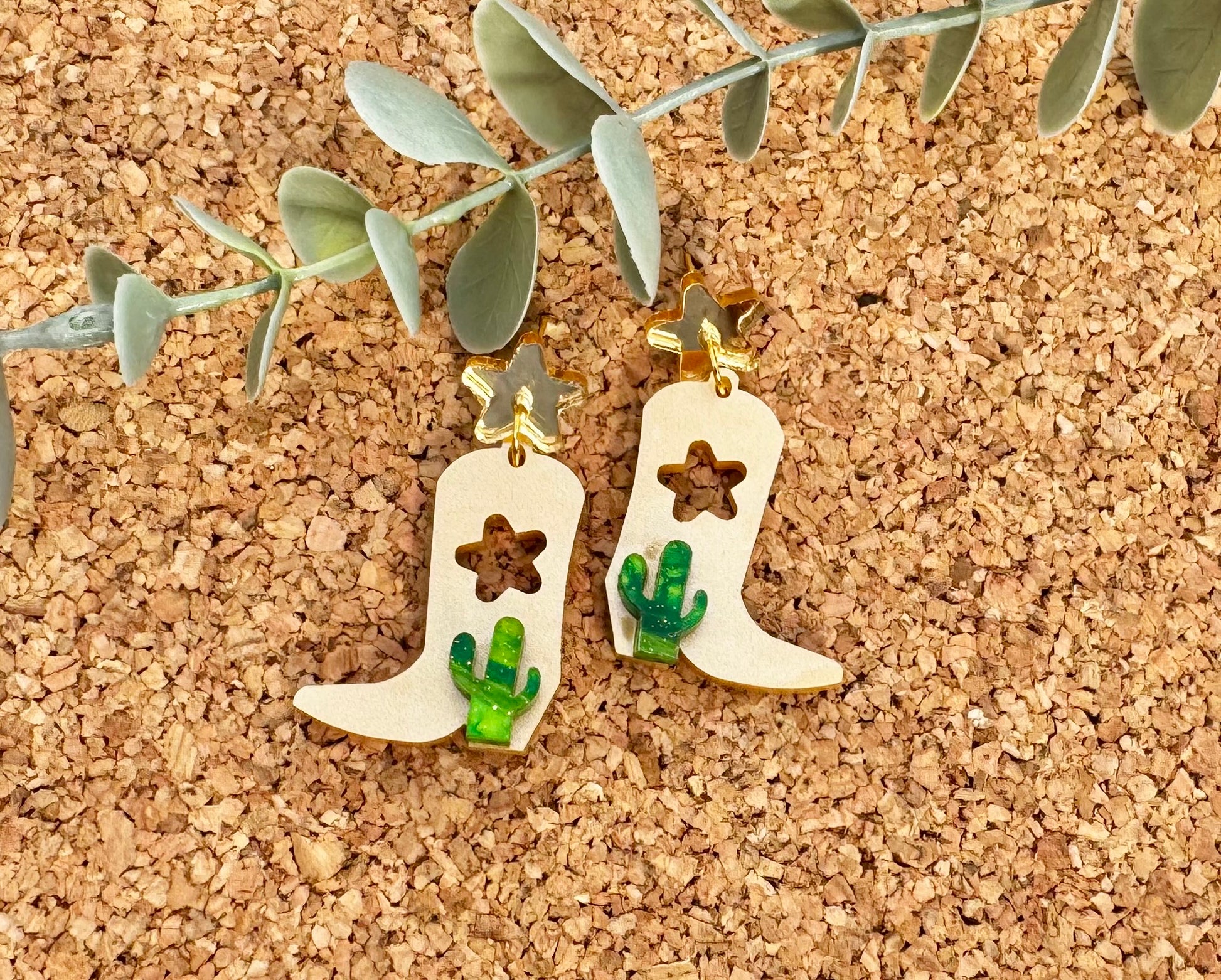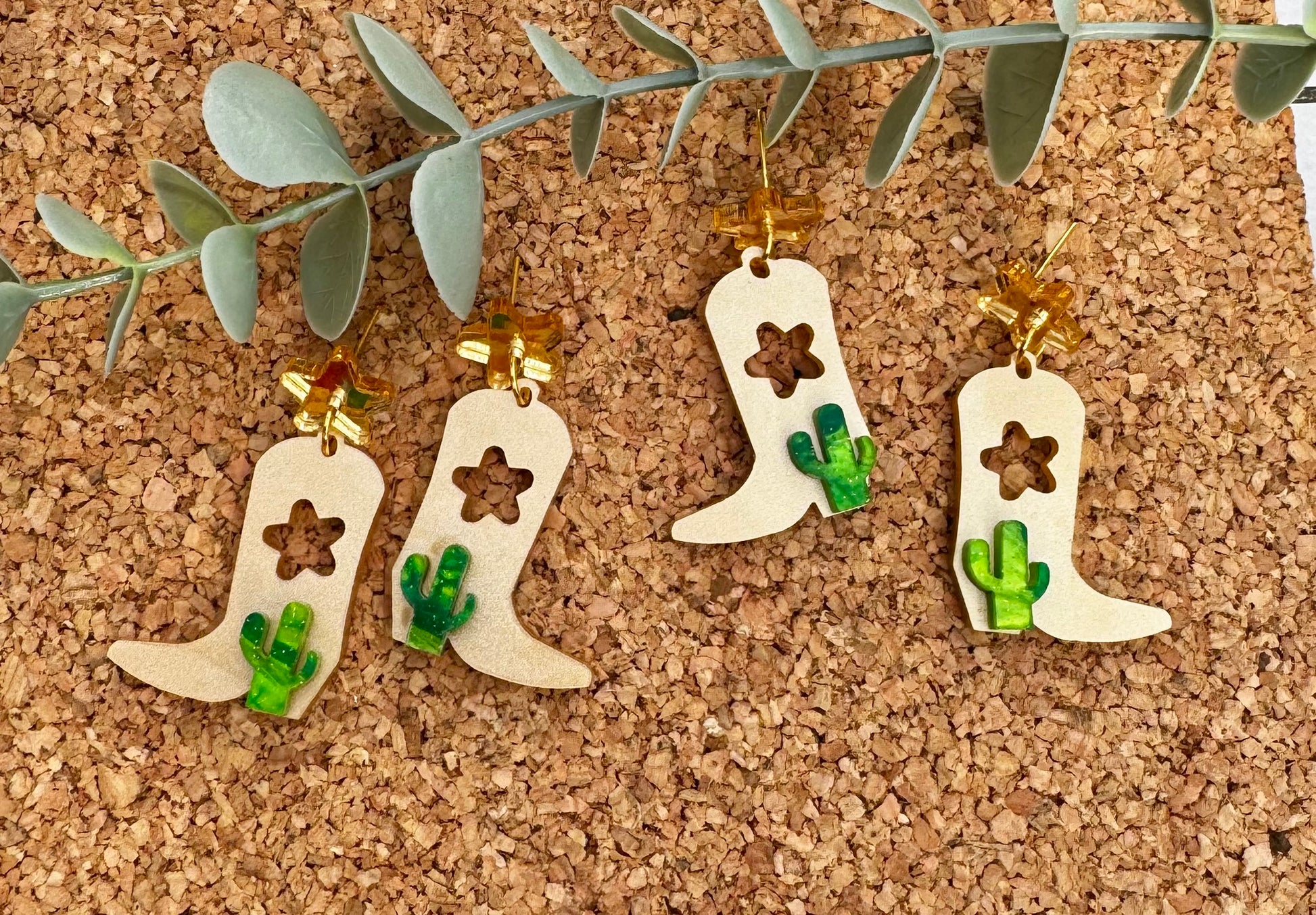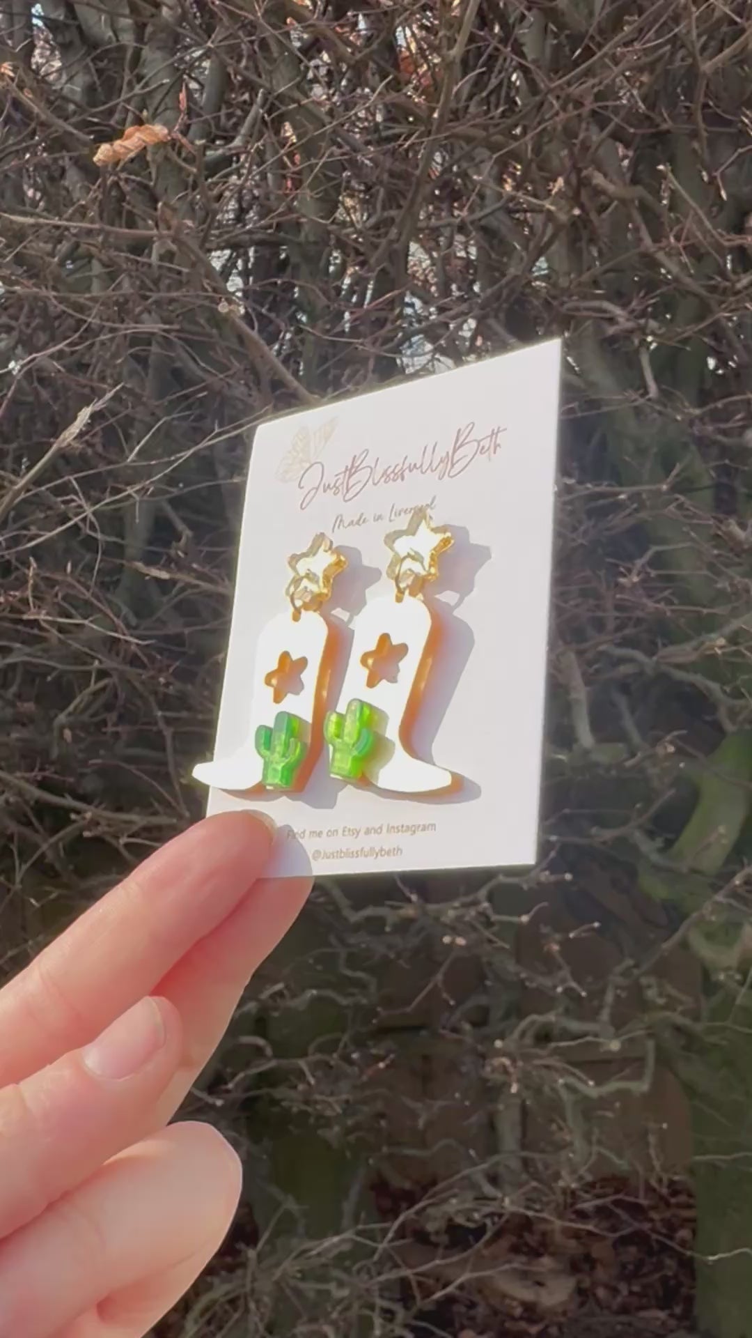 Acrylic Cowboy shaped boots with an acrylic star topped stud earring.