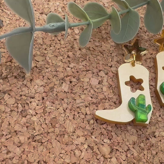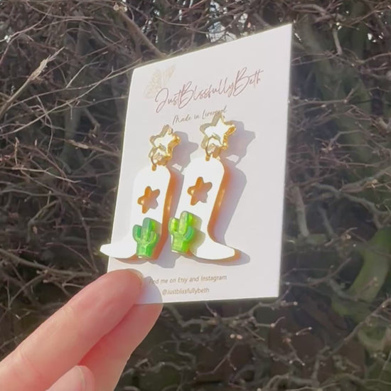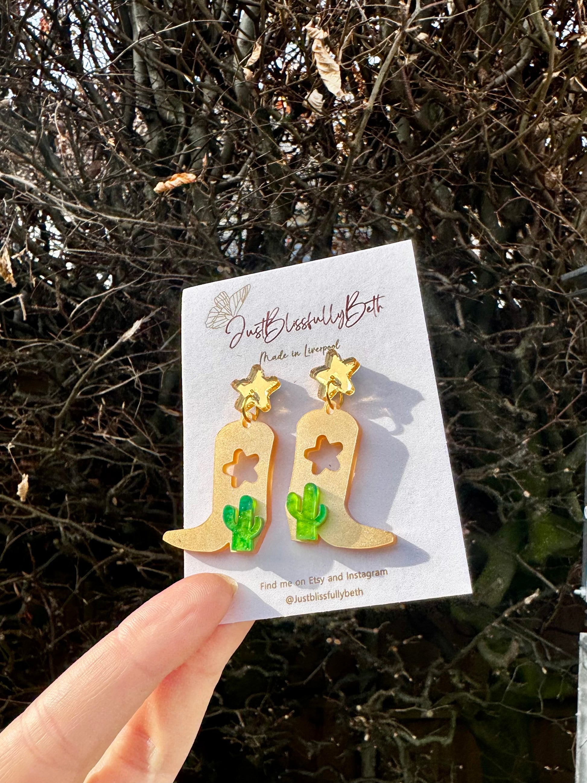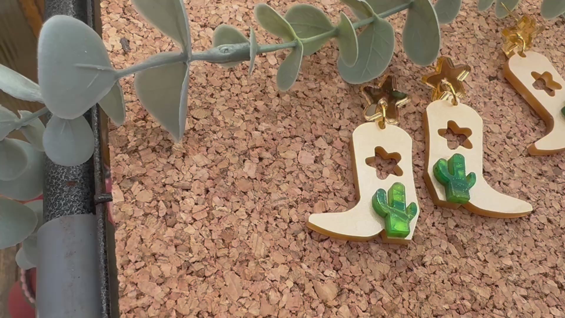Acrylic Cowboy shaped boots with an acrylic star topped stud earring.
