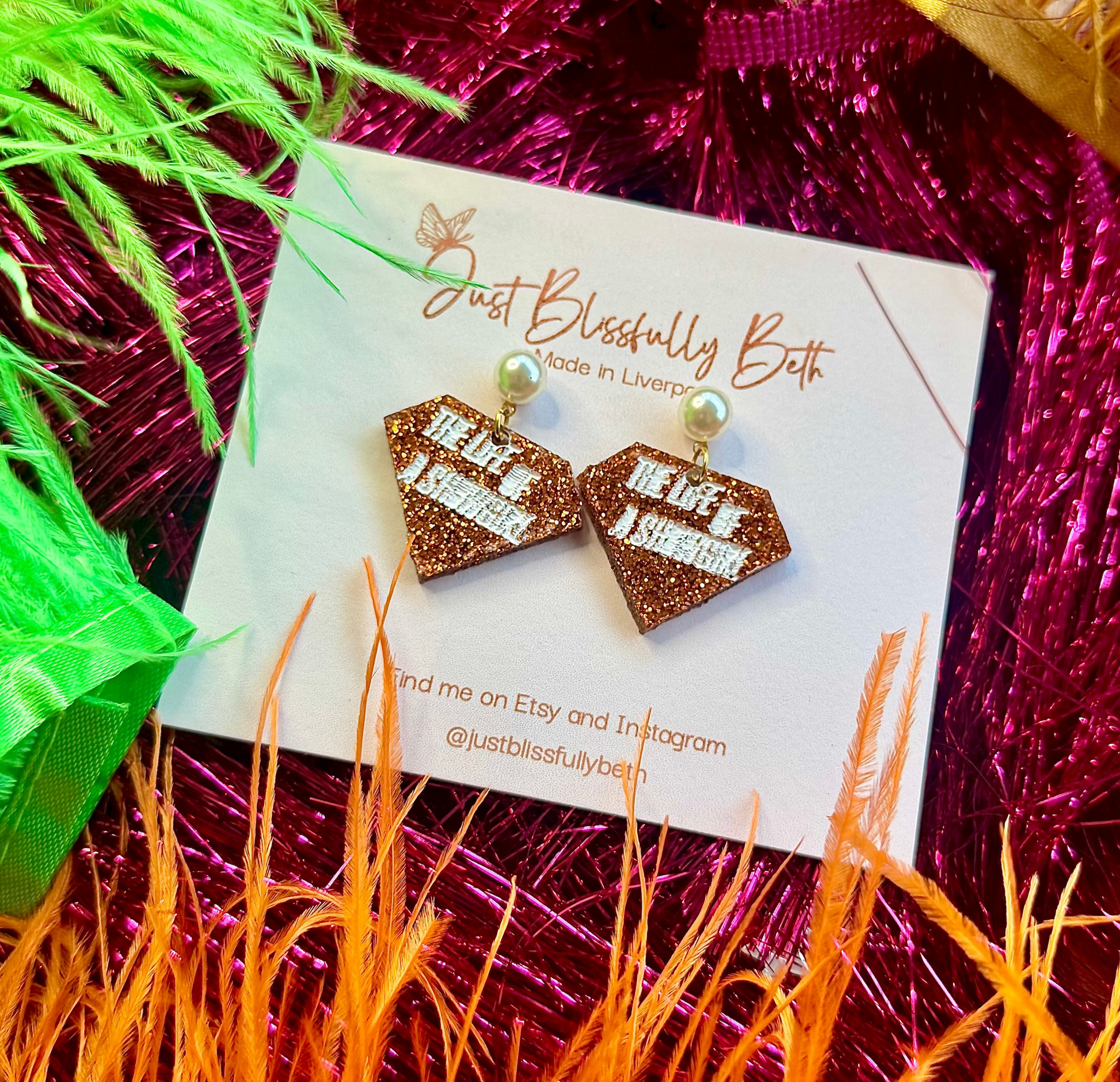 Each pair of JustBlissfullyBeth earrings are slow-made by hand in Liverpool by me with love. As each pair are handmade, they will vary slightly from pictures and may have minor imperfections making them beautiful one offs! They may also differ in the shade.